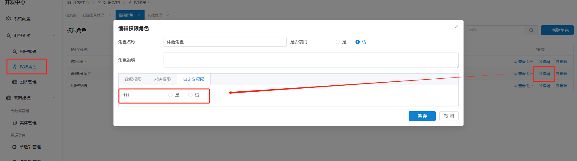 编辑任意权限角色,弹出弹窗后可在自定义权限页签内进行配置。